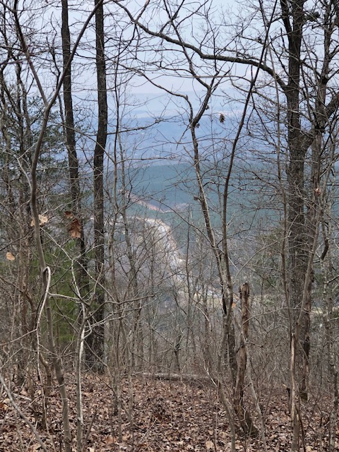 Copperhead, Little John, Ryan and I aren’t the only ones making tracks today. A segment of the trail passes along an old dirt road, and in the dirt are fresh turkey and deer tracks! So very appropriate, the turkey tracks. The word Pinhoti is Cherokee for Turkey Home. The symbol on the plastic Pinhoti Trail blaze is the turkey track!