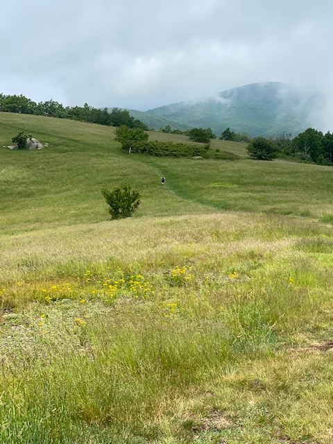 We’ve had close to 5,000 feet of climbing today and we’re both very tired. However, after the long, energy sapping day we’re rewarded with an amazing walk across a high mountain meadow. The clouds part just long enough for a view of the rugged Virginia Blue Ridge. Could not have had a better time!