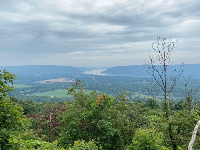 Busy, heavy commercial traffic, US-22. There are two long bridges to cross, first the Juniata, then Clark’s Ferry across the Susquehanna. We must then cross three busy sets of railroad tracks before finally beginning our ascent of Peters Mountain, a thousand-foot climb up switchbacks, through rocks and boulders, to reach more rocks and boulders (big time) on the ridge. Well worth the climb, though, for the wide, impressive views down to the Susquehanna River and the village of Duncannon.