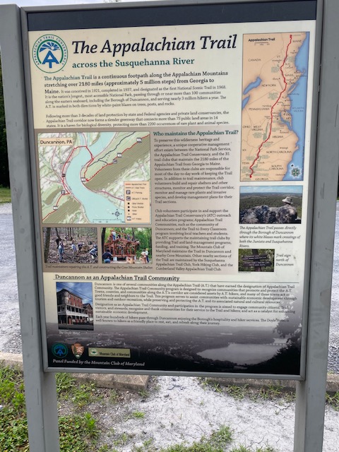 The trail heads out of Duncannon on one of the residential side streets, but we trek out on the main drag–in a gentle shower. Couple blocks down, a car pulls to the side. Lady comes toward me, greets me. “I’m Trail Angel Mary” she says. Big smile on her face. “I shuttle hikers anywhere they want; got two loaded in there now–can I get your picture?” she asks. I stop. The rain has slacked. Trail Angel Mary and me, we get our picture taken.